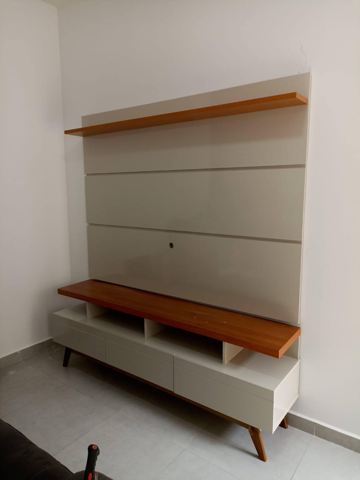 Rodrigo montou o painel com Rack , precisou fazer cortes no painel ripado, resolver na hora. Ficou perfeito